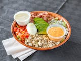 Iceberg and romaine lettuce with chicken, tomatoes, bacon, blue cheese crumbles, boiled eggs and avocados.