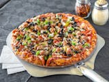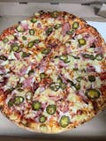 Ham, pepperoni, mushrooms, onions, green pepper, olives, sausage, extra cheese.