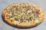 Alfredo sauce, chicken, pepperoni, basil, onions.